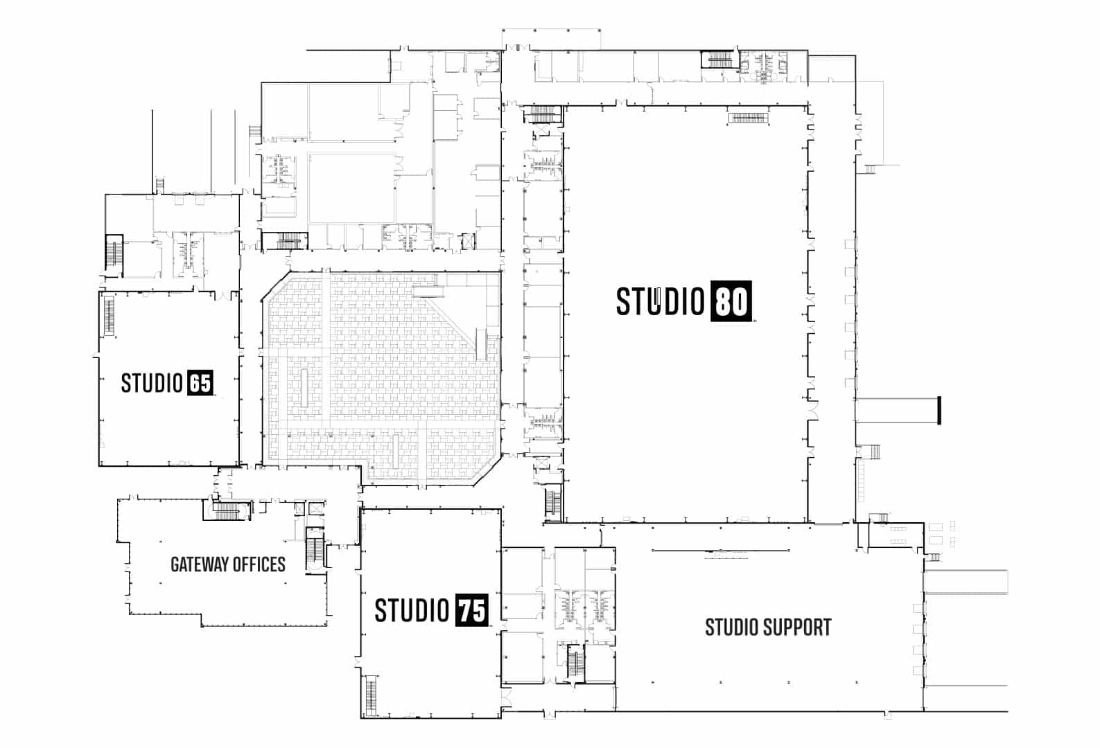 The completed complex at 900 Spirit of St. Louis Boulevard spans approximately 300,000 square feet and stands as the largest rehearsal and production facility of its kind in the United States. Three purpose-built studios — Studio 80, Studio 75, and Studio 65 — together offer 80,000 square feet of studio space, plus 25,000 square feet of outdoor courtyard and an additional 25,000 square feet of support space.
